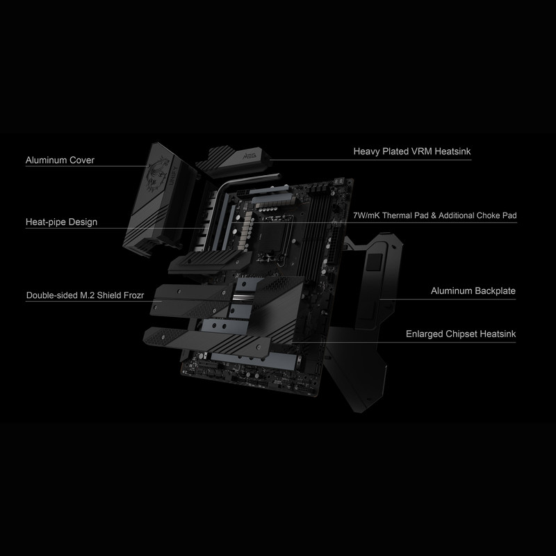 Outstanding Cooling Solution: Aluminum Cover, VRM Heat-pipe, 7W/mK thermal pads, Double-sided M.2 Shield Frozr and Aluminum Backplate ensure the extreme performance with low temp.